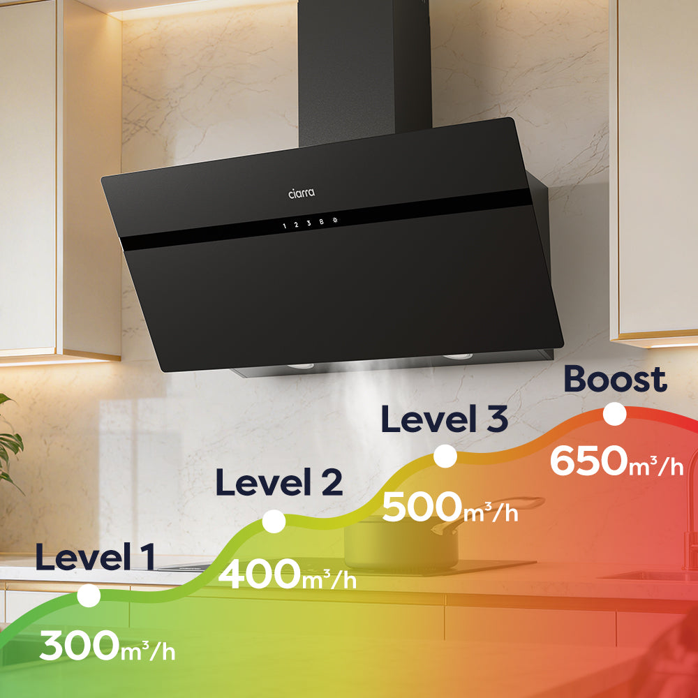 • 💨 650 m³/h Luftleistung: Beseitigt Kochdünste und Gerüche in Sekundenschnelle. Mit 4 Leistungsstufen inklusive Boost-Modus bietet das Gerät präzise Kontrolle für jede Kochsituation, von sanftem Köcheln bis hin zum scharfen Anbraten.