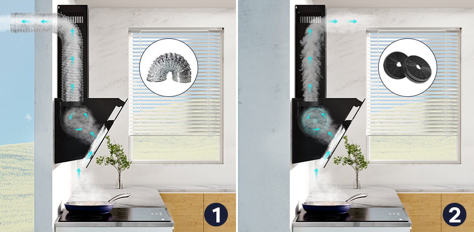 2. Betriebsart: Abluftsystem für maximale Leistung oder Umluft mit Aktivkohlefilter, wenn kein Abluftkanal möglich ist.