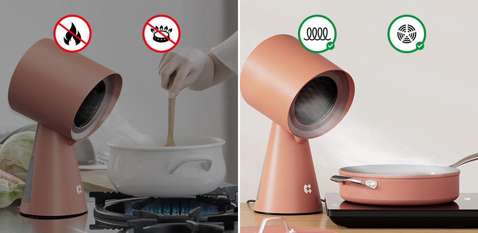 - ⚠️Achtung⚠️: HOOD TO GO wird für die Verwendung mit Kochgeräten (z. B. Induktionsherd, Elektrogrill, Elektroherd usw.) empfohlen und kann nicht für das Kochen mit offener Flamme verwendet werden. Der Lufteinlass sollte so nah wie möglich an der Kochfläche anderer Geräte sein (nicht mehr als 10 cm entfernt), um die Effizienz der Absaugung zu verbessern.