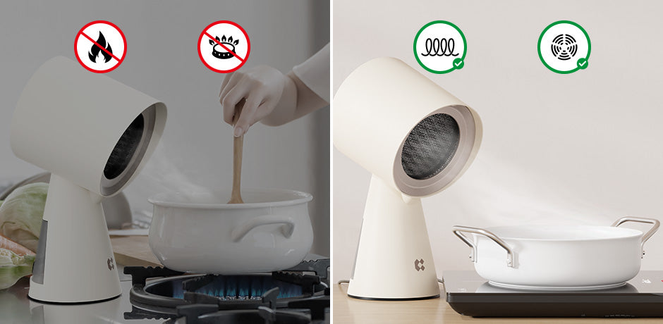 • ⚠️Achtung⚠️: HOOD TO GO wird für die Verwendung mit Kochgeräten (z. B. Induktionsherd, Elektrogrill, Elektroherd usw.) empfohlen und kann nicht für das Kochen mit offener Flamme verwendet werden. Der Lufteinlass sollte so nah wie möglich an der Kochfläche anderer Geräte sein (nicht mehr als 10 cm entfernt), um die Effizienz der Absaugung zu verbessern.
