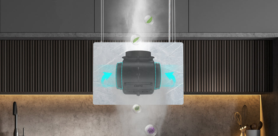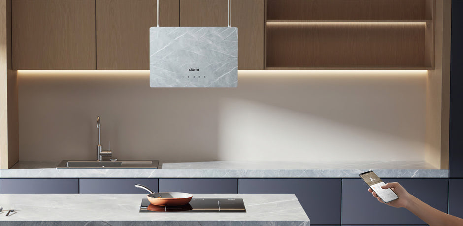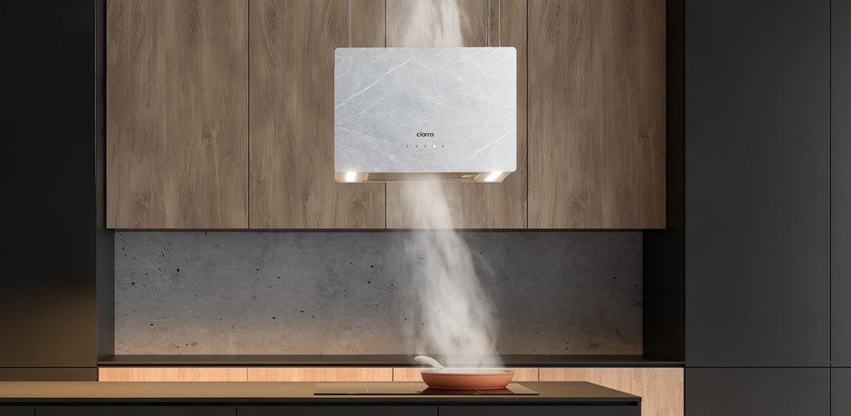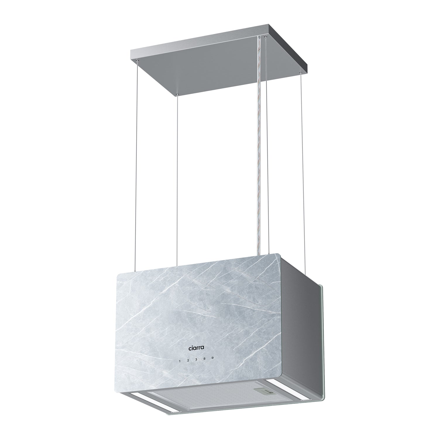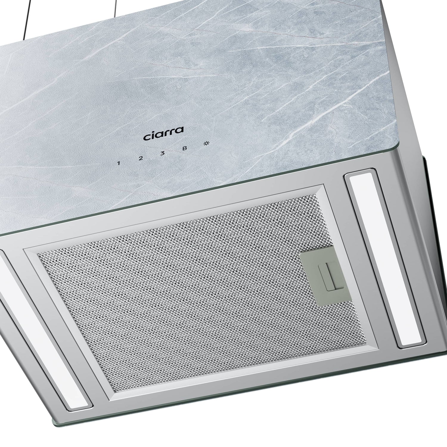 Ciarra Pinnacle 48 cm große Insel-Dunstabzugshaube aus Glas in Ivory Mist Marmor CBCW4850-OW