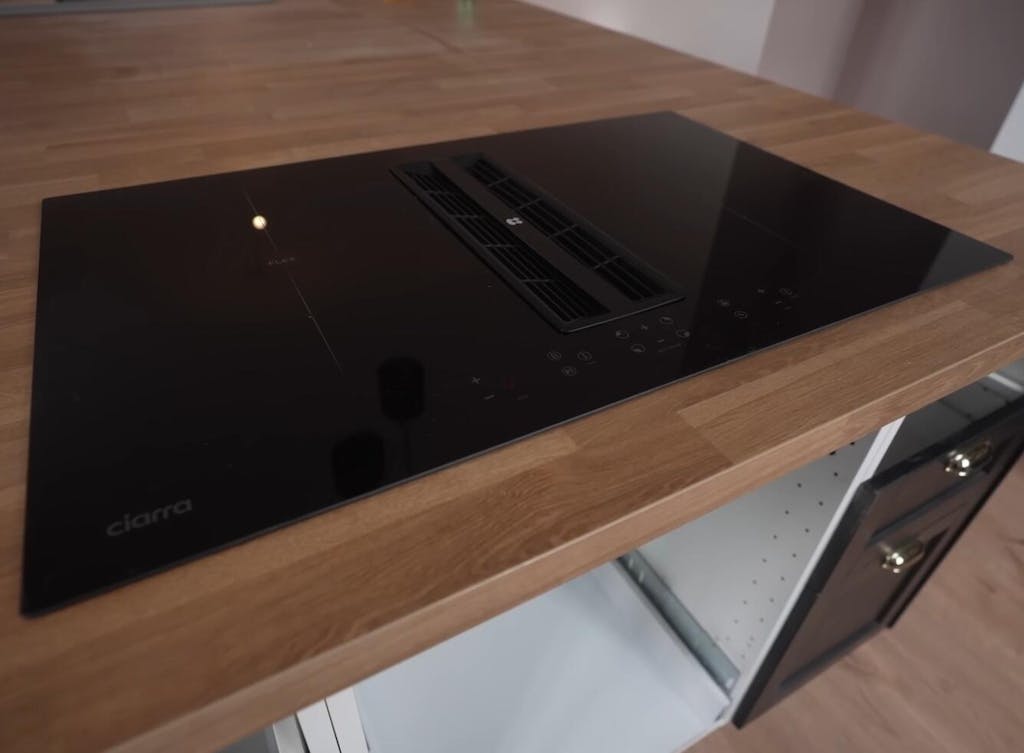 Induktionskochfelder mit integriertem Dunstabzug kombinieren eine Induktionskochfläche und eine eingebaute Abzugshaube (Downdraft-System).