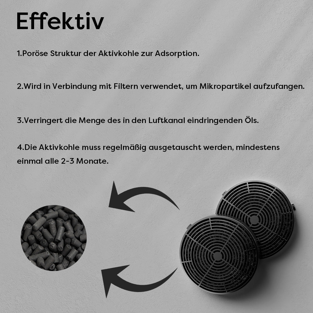 Die Kohlefilter sind so konzipiert, dass sie Gerüche und Feuchtigkeit vom Kochen absorbieren, bevor die Luft in Ihre Küche zurückgeführt wird.