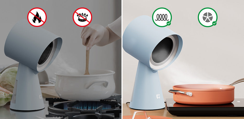 - ⚠️Achtung⚠️: HOOD TO GO wird für die Verwendung mit Kochgeräten (z. B. Induktionsherd, Elektrogrill, Elektroherd usw.) empfohlen und kann nicht für das Kochen mit offener Flamme verwendet werden. Der Lufteinlass sollte so nah wie möglich an der Kochfläche anderer Geräte sein (nicht mehr als 10 cm entfernt), um die Effizienz der Absaugung zu verbessern.